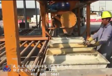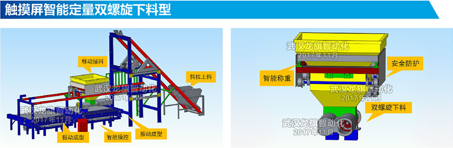 斜拉上料负责从罐装车中接混凝土,讲混凝土斜拉提升至移动接料系统;移动接料系统内含有自动称重系统和双螺旋下料系统;振动称型系统内含高频率振动器,快速振动成型;